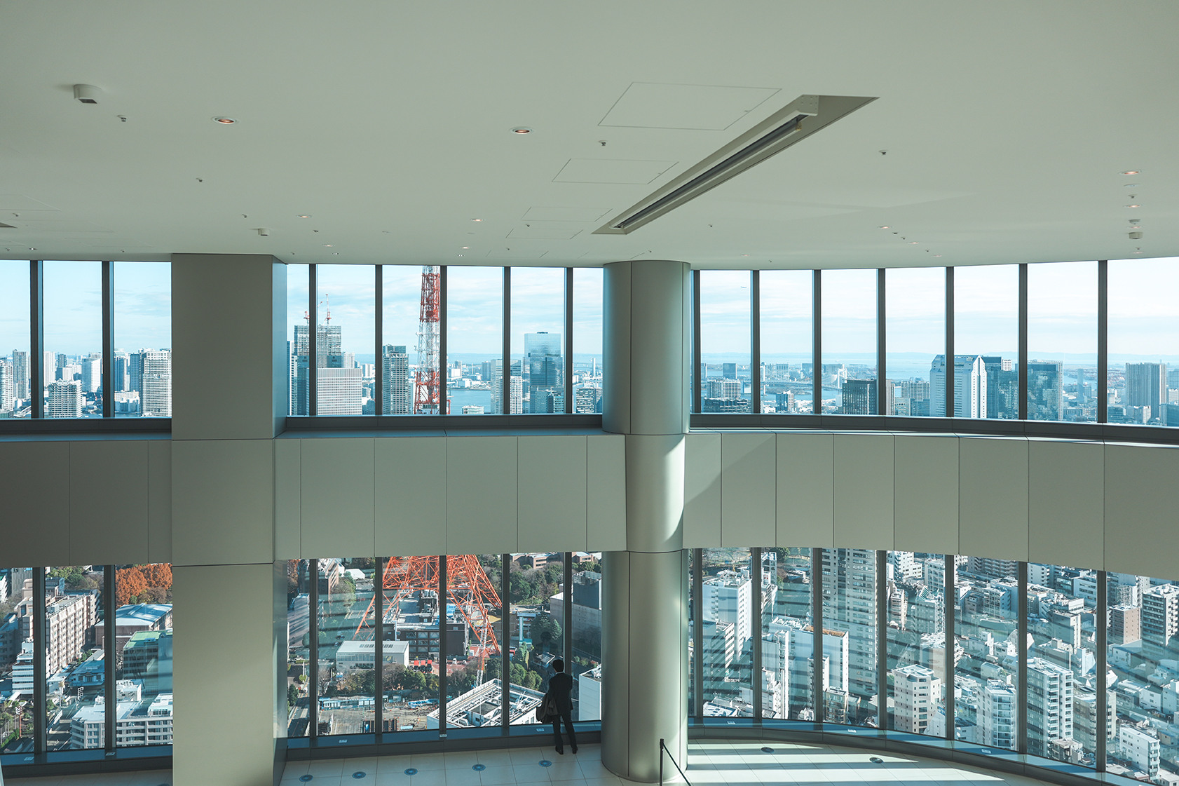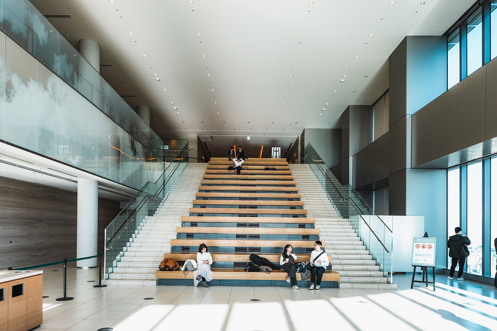 The observation deck in Azabudai Hills has always been a favorite spot of mine. Entry to the deck requires a fee of ¥500 per person. The space is divided into two main sections: the cafe, which offers tables suitable for meetings and work, and a more relaxed stairs area that doubles as benches. Both areas face massive floor-to-ceiling windows, granting visitors a sweeping view of Tokyo Tower and the sprawling city skyline.